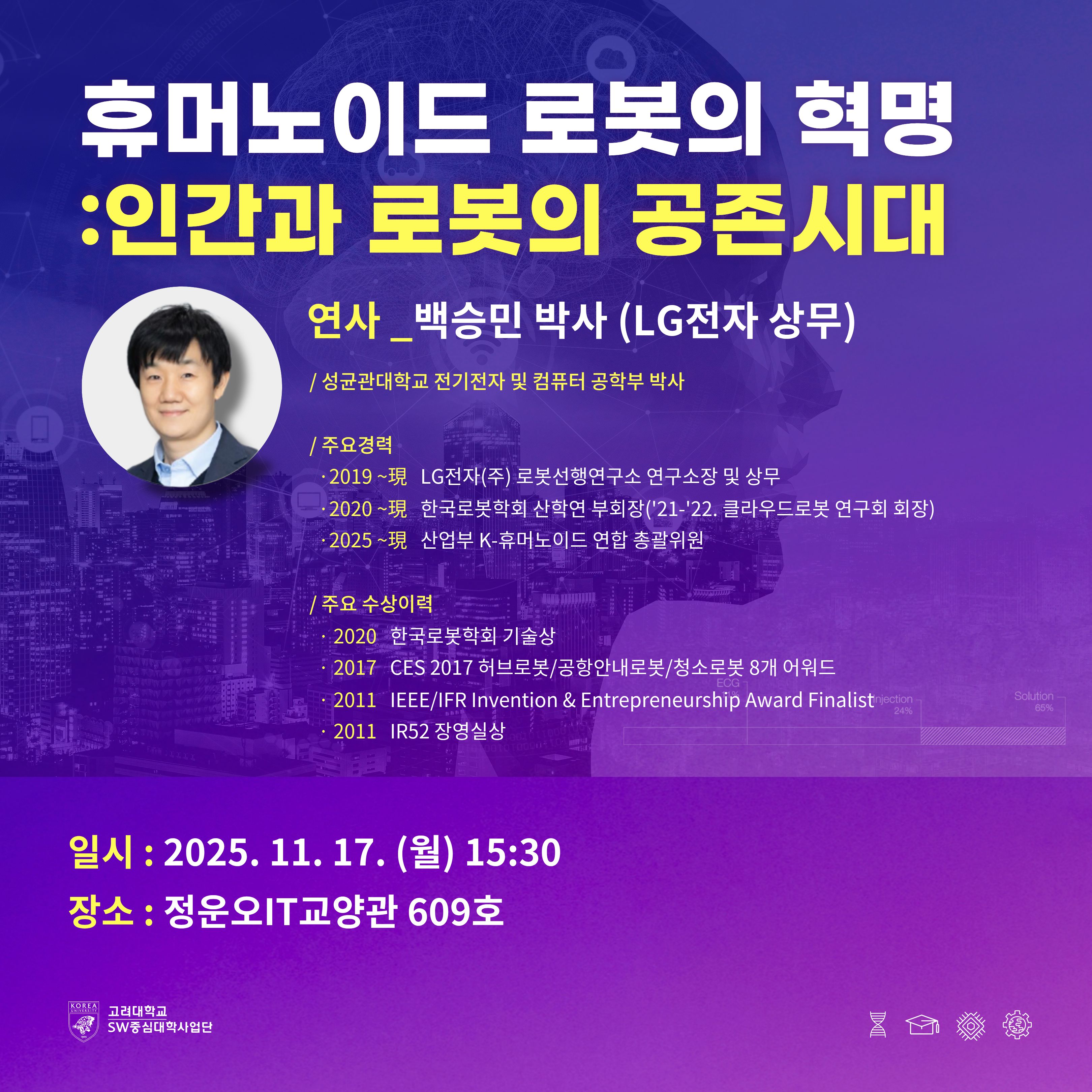| 제목 | 특강 휴머노이드 로봇의 혁명: 인간과 로봇의 공존시대 연사: 백승민 박사(LG 전자 상무) |